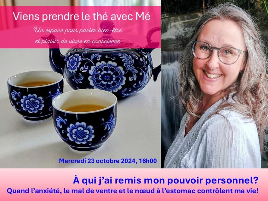 Viens prendre le thé avec Mé, où Mélanie Chaussé vous partage de l'information et des expériences en lien avec l'énergie d'un des 7 principaux centres de conscience (Les 7 principaux Chakras) Aujourd'hui nous survolons le Chakra Plexus Solaire - Associé au pouvoir personnel.