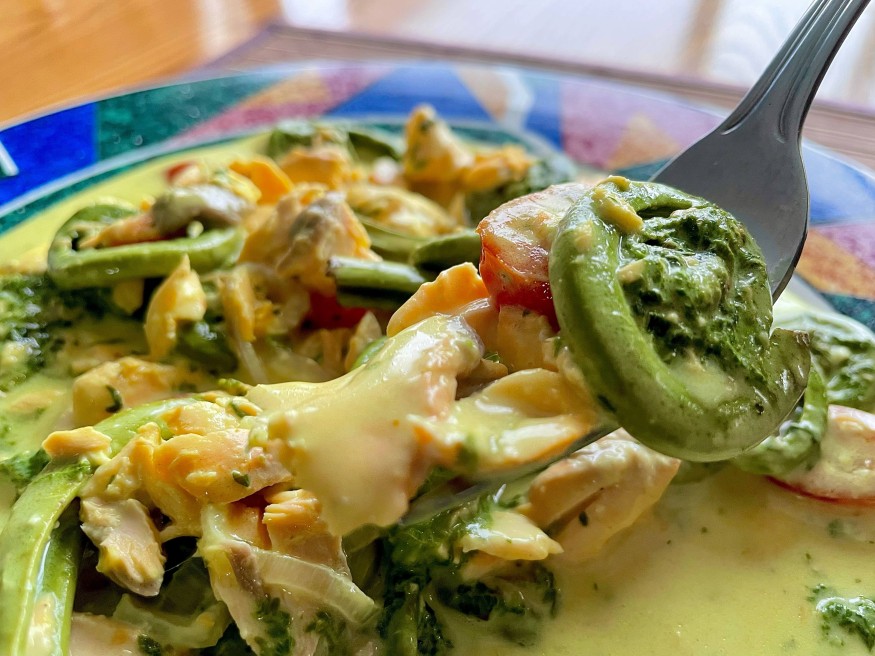 Puisant mon inspiration dans la riche et audacieuse cuisine de l'île de Sumatra, en Indonésie – où les fougères sont un délice courant, souvent mariées aux saveurs de la mer – j'ai imaginé cette recette mettant en vedette ma récente récolte de tendres têtes de violon. J'ai cherché à recréer l'équilibre vibrant des saveurs de Sumatra, avec ses notes ardentes et parfumées, en l'associant à la délicatesse du saumon.